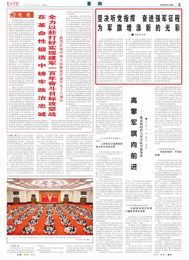 显然,在强大的军队的旅程之前,明确服从了党的命令,在军事旗帜上增加了新的荣耀■最近的人民解放日常评论员XI总统签署了一项命令,签署了人民解放军队的军事旗帜,该军队将于2025年8月1日开放。要遵循政治领导,以实现其努力和责任,并努力努力,并实现了一项努力和责任,并实现了100年的努力,并在100年中建立了努力,并在100年中建立了努力。一个新时代和新旅程。我们的军队国旗诞生于战争的烟雾中,并随着人民军的成长和成长而开发和建立。 90多年来,人民军队一直以党的旗帜,他们走进了母亲的土地,带来了希望的统一,在血腥的战斗中进行了斗争,勇敢地击败了所有敌人,征服了所有的艰辛,没有对中国人的亲戚贡献,使中国人的贡献是富裕而坚强的!自18T自从中国共产党,中央委员会,中央军事委员会和习近平国民大会以自建立新中国以示例性的决定和力量为生以来,领导了广泛,最深刻的国防和军事改革,公民军具有新的系统,一种新的结构,一种新的模式以及新的外观。在加强军队并在新时代建立军队的奇妙过程中,它与建造一种新型的军事结构和布局,以及改善具有中国特征的现代军事力量系统,并在新时代充实和开发了人民军队的军事旗帜。新时代的人民陆军国旗制度带来了党的人军队的光荣旅程,并努力勇敢,并表现出从大型到强者和一流的迁移的希望。军队的所有官员和士兵都必须深刻理解他的在新时代,人民陆军国旗系统的复曲遗产和精神灵感,推进了光荣的传统,并精致了我们党和军队的风格,努力加强军队,并继续创造出国防和军事劳动的新局势。我们必须充分执行该党在军事中充分领导的基本原则和系统,全面加强公民陆军党的建设,继续使用创新的theoriesido团结心灵,始终保持人民军的政治本质,并确保枪支始终遵守党的命令。我们必须完成加强军事训练和准备,加深实际的军事训练,稳定而灵活,以进行军事斗争,提高我们捍卫国家主权,安全和发展利益的战略能力,并确定党和人们所委托的新季节的使命和活动。我们求婚LD促进了我们军队的高质量发展,继续加深改革和变革,全面加强军事管理,加速军事理论的现代化,军事组织的现代化,军事人员的现代化以及武器和kclothes的现代化,并促进新时代的军事力量,以采取更大的步骤。军事精神将永远不会改变,军事旗将永远参加聚会。整个军队必须将习近平与XI Jinping一起围绕党中央委员会作为主要委员会,然后是习近平对社会主义和中国特征的指导,这是一个新时代的战略军事政策的新时代,深刻地理解了“两个机构”的慷慨重要性,从而增强了“四个意识到的“两个委员”的委员会,并遵循了军事委员会的责任。E中央军事委员会和习近平总统努力组成一百年来,试图使一流的军队稳定下来,并将努力全面使用现代的中国风格。提供强大的战略支持,以促进发展强大的国家和民族刺激的巨大原因。