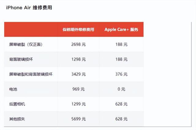 Apple China的官方网站于9月12日发布了一篇博客文章,宣布了四种型号,iPhone 17,iPhone Air,iPhone 17 Pro和iPhone 17 Pro Max的越野维修费用。在更换电池方面,苹果没有增加替换费,而iPhone空气与969元的iPhone 16 Pro系列相同。为了降低风险和成本,Apple建议用户购买AppleCare+。在AppleCare+下,大多数维修成本可以降低188元和628元之间。 苹果宣布了维护iPhone 17的估计成本来源。苹果中国的官方网站,这在家