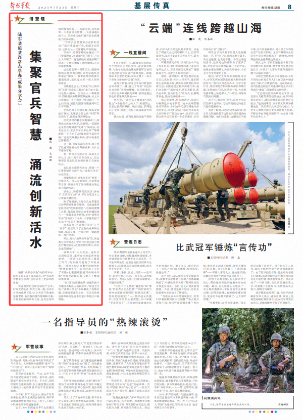 特定的陆军旅将定期通过“成功的会议”来举行 - 组建官员和士兵的智慧,并在现代水域中流动■张经常处理“成功共享的会议”,张chaosheng,张chaosheng,布里加达的特定军队的一支由布里加达(Brigada of Brigada)组成的干事,这是一位特定的brigada官员。”公司组织的活动开始于去年。时间很灵活,机动,形式是非常规的。官员和士兵所分享的成就是不同的:有一部分自我支持的设备,八卦,探索和创新的培训方法以及摘要经验和维护...张·乔申(Zhang Chaosheng)表示,这些成就与Onderier and tear的独立式努力相关,并在另一端建立了一个独立的努力,并成为了他们的独立努力,并成为了他们的独立努力,并将其成为了他们的新努力。 “你为什么想处理S面对作者的好奇心,张夏申(Zhang Chaosheng)回答说,它必须从旅行机训练开始。在训练期间,许多越过机器在穿过门形的障碍物之前“倒塌”。林·埃奇亚奥(Lin Erqiao)的中尉拍了照片,他的声音充满了焦虑。这是那一周的第三次。由于跨境眼镜的问题,跨境机器训练被迫“拖累”。当看到新的培训课程被迫遇到了一群人,他们是否遇到了一群人的访问。上级”或“依靠自己解决问题”,讨论是僵局。如果一切都缺失,第四小队的负责人Chen Liaoyuan静静地站着,从衬衫的口袋里拿出一个小物体:“我自己购买了一个方向天线,这可能会使许多图片同时发送眼镜。”礼物的脊柱被半偏见和半双,并且在现场进行了安装进行测试,并发现显示屏上的“雪花”实际上丢失了,图片变得清晰稳定。在摩ab邦时间内被打扰的困难问题得到了解决。每个人都很高兴是合乎逻辑的。出乎意料的是,球队的一位副负责人突然“攻击”了陈·洛伊亚(Chen Liaoyuan):“陈的负责人,你为什么不早些时候释放它?” Chen Liaoyuan的脸突然变成红色,但他的反应语气非常紧张:“我考虑过,我原本计划为自己保留它。”这个场景触发了张·乔申(Zhang Chaosheng)的思考:勇士在提高培训质量和效率方面取得了创新的成就,他们为什么不分享呢?在与一些官员和士兵交谈后,张·乔申(Zhang Chaosheng)坚持认为Ough一些官员和士兵有自私的愿望,主要原因是该公司没有提供展示和沟通的机会。公司党分支研究了并决定建立一个通信平台的是,智慧是智慧,“成功共享的会议”已经成为。 Chen Liaoyuan成为“共享会议”的第一个支持者。他详细介绍了安装天线方向的程序,并从安装和奉献精神,谨慎等方面进行了图片传递眼镜。在讲台下,官员和士兵仔细地听了,不时在笔记本中记录了基本信息。除了陈·洛亚尤(Chen Liaoyuan)外,其他官员和士兵还以自己的创新成就出现在舞台上。 “存储程序”能够优化战斗图书馆的竞争,自制便携式工具箱以及提高T效率的辅助技能他的夜间拍摄...张chaosheof课程,在“成就成就的第一个会议”的仅2小时内,每个人都贡献了近30个“金想法”和物理对象。他们不停止“成就共享会话”会话,而是为成功的变化设计了一个完整的链接:痛点收集 - 计划计划 - 测试测试 - 促销和使用。因此,在每次“成就实现成就”会议之后,公司将选择有效且富有成效的创造性解决方案进行孵化和验证,并且在实现了预期的结果后,将在整个公司中促进。结果分配了,每个人都受益。团结的气氛,彼此帮助以及对公司部队的智慧更加强大。小队负责人制作的小队自己的头部图帮助新兵改善了他们的训练成绩;第三行负责人制作的“手的特定手处理”与他的努力相结合CE允许年轻士兵避开道路;该队小队领导人副阵容阵容领袖撰写的“脚八卦”提高了培训和效率的整体质量……”该公司战斗的有效性的建设。”该公司的首席官员说,“成功共享”不仅是分享的特定问题,而且塑造了公司的文化。官员和士兵克服困难的意识和能力取决于变化和变化。