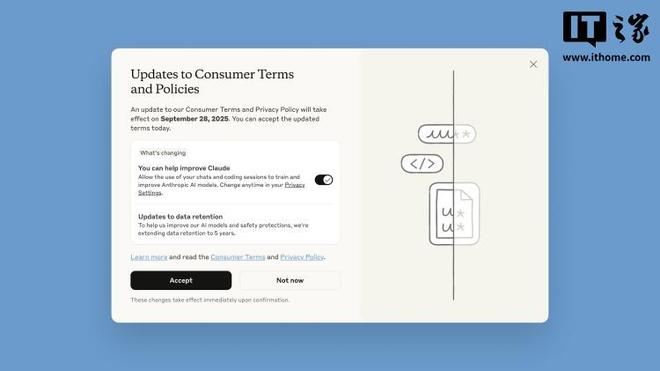 这是在8月29日新闻的家中,拟人化宣布,它将开始使用用户数据培训AI模型,其中包括新的聊天写作会话和代码写作会话,除非积极选择用户。同时,该公司还扩大了五年的数据维护政策,这也适用于尚未选择的用户。根据周四发表的拟人博客文章,所有用户都必须在9月28日进行选择。如果用户现在单击“接受”,则拟人化将立即开始使用其数据训练该模型并将数据维护长达五年。此设置仅适用于“新或重新打开的聊天和代码写作会话”。尽管使用人类使用其数据来培训模型的用户不包括培训范围内用户未打开的历史聊天或代码会话。但是,一旦用户继续使用旧会话,基于数据的数据将包含在练习中。人类在文章中指出,此更新涵盖了Claude的所有订阅层,包括Claude Free Edition,Pro Edition和Premium Edition(Max),“当用户通过订阅上述订阅使用Claude代码时,同样适用。”但是,此更新不适用于人类层次结构的商业用途,例如Claude Gov,Enterprise Edition和Edition Edition,也不适用于API呼叫场景,包括通过亚马逊BedRock和Google Cloud Vertex等第三方平台使用API来确认proyence persiences persiences clainsclaude conso popso copso propso copso copso forso copso for noce opso propso''都可以选择范围。设置“以推迟该决定的按钮,但是选择必须在9月28日之前完成。应该注意的是,许多用户可以快速单击“接受”而无需仔细阅读条款和内容。在用户会看到的弹出窗口中,大字体显示“消费者术语”and Policy Updates", and the text below states "Our consumer terms and privacy policy updates will be effective on September 28, 2025, you can accept updated terms today". There is a known black "accept" button under the pop-up window. Home noticed that in the small word section below the button, there were many lines of text that readof "Allow your chat and code history to write sessions for training and improving anthropical AI models", with an on/off toggle next to it, and in默认情况下,“在”状态。选项可以改变他们的CHOICE在任何时间通过隐私设置,但是新设置将来只会在DAT组合中生效 - 用于模型培训的数据无法撤消。 Anthropic在博客文章中说:“为了保护用户的隐私,我们将许多工具和自动流程结合在一起,以过滤或淡淡的敏感数据。我们不会在第三方出售用户数据。”